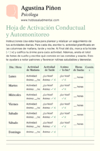 Una hoja de activación conductual y automonitoreo es una herramienta sencilla que permite registrar actividades diarias y estados de ánimo para identificar cómo nuestras acciones influyen en nuestro bienestar.