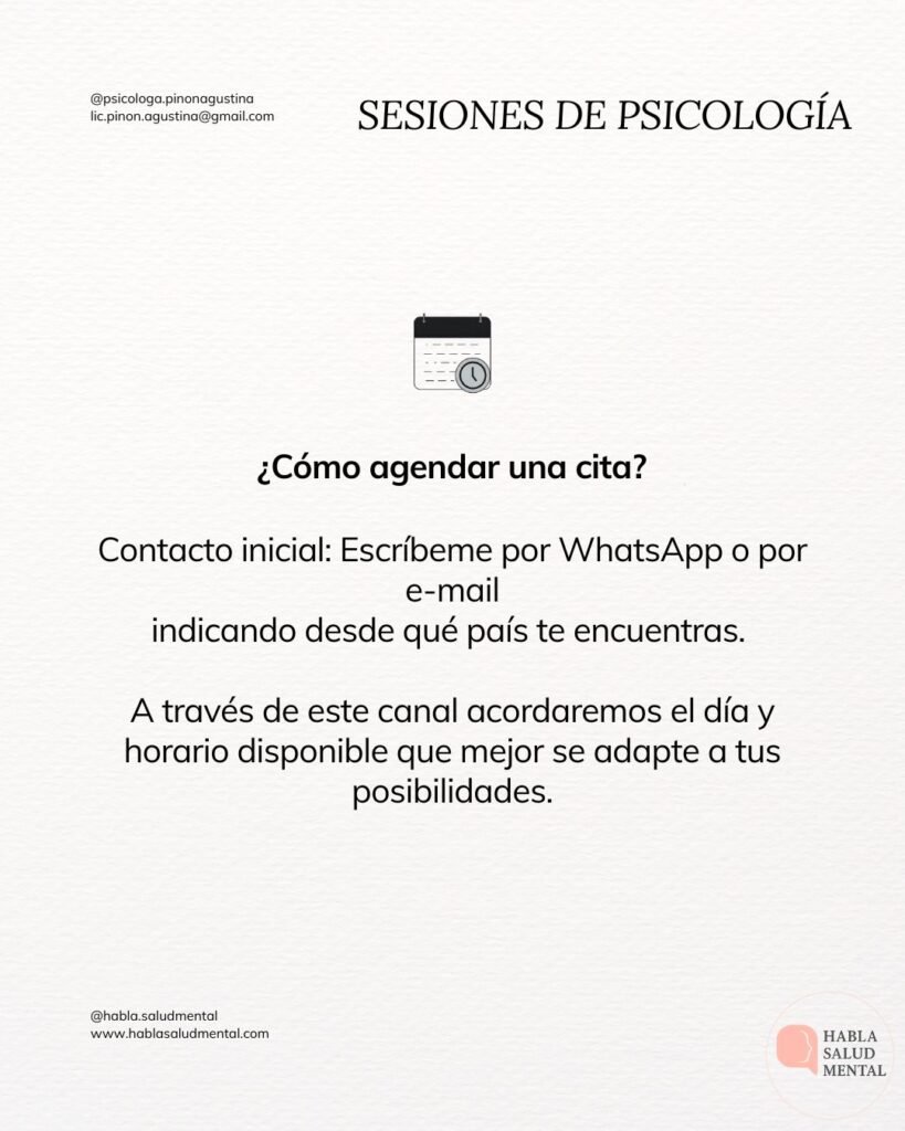 Contacto inicial: Escríbeme por WhatsApp / e-mail indicando desde qué país te encuentras. A través de este canal acordaremos el día y horario disponible que mejor se adapte a ti.