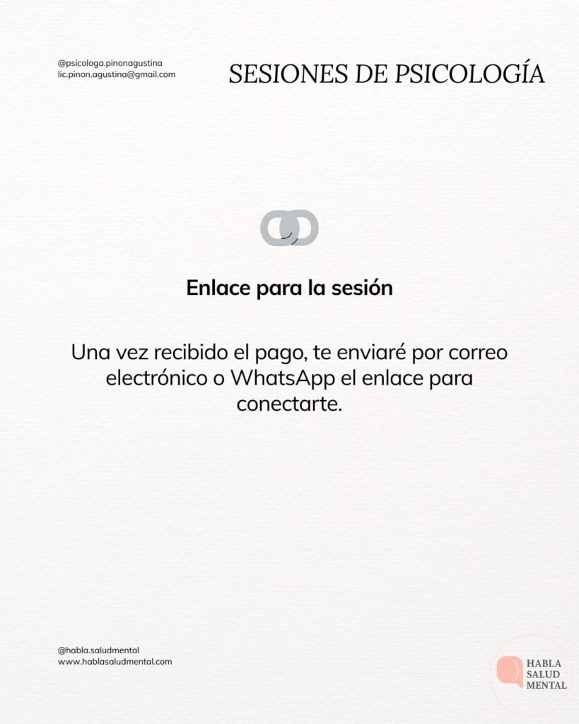 Enlace o dirección de la sesión: Una vez recibido el pago, te enviaré por correo electrónico o WhatsApp el enlace para conectarte.