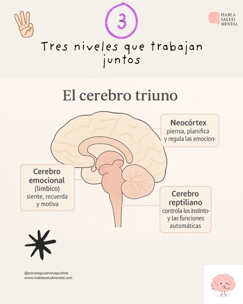 • 🐍 Cerebro reptiliano: controla los instintos y las funciones automáticas como respirar, huir o defenderse.