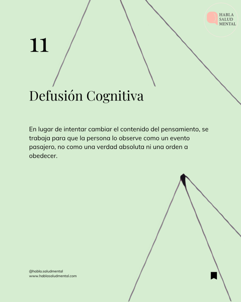 La defusión cognitiva es una estrategia que busca reducir la influencia literal y emocional de los pensamientos disfuncionales, promoviendo una relación mas flexible y consciente con el contenido mental.